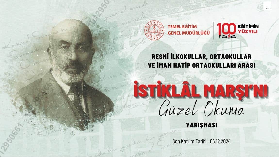 İstiklâl Marşı’nın Kabulü ve Mehmet Akif Ersoy’u Anma Günü kapsamında resmî ilkokullar, ortaokullar ve imam hatip ortaokulları arasında İstiklâl Marşı’nı güzel okuma şiir yarışması.